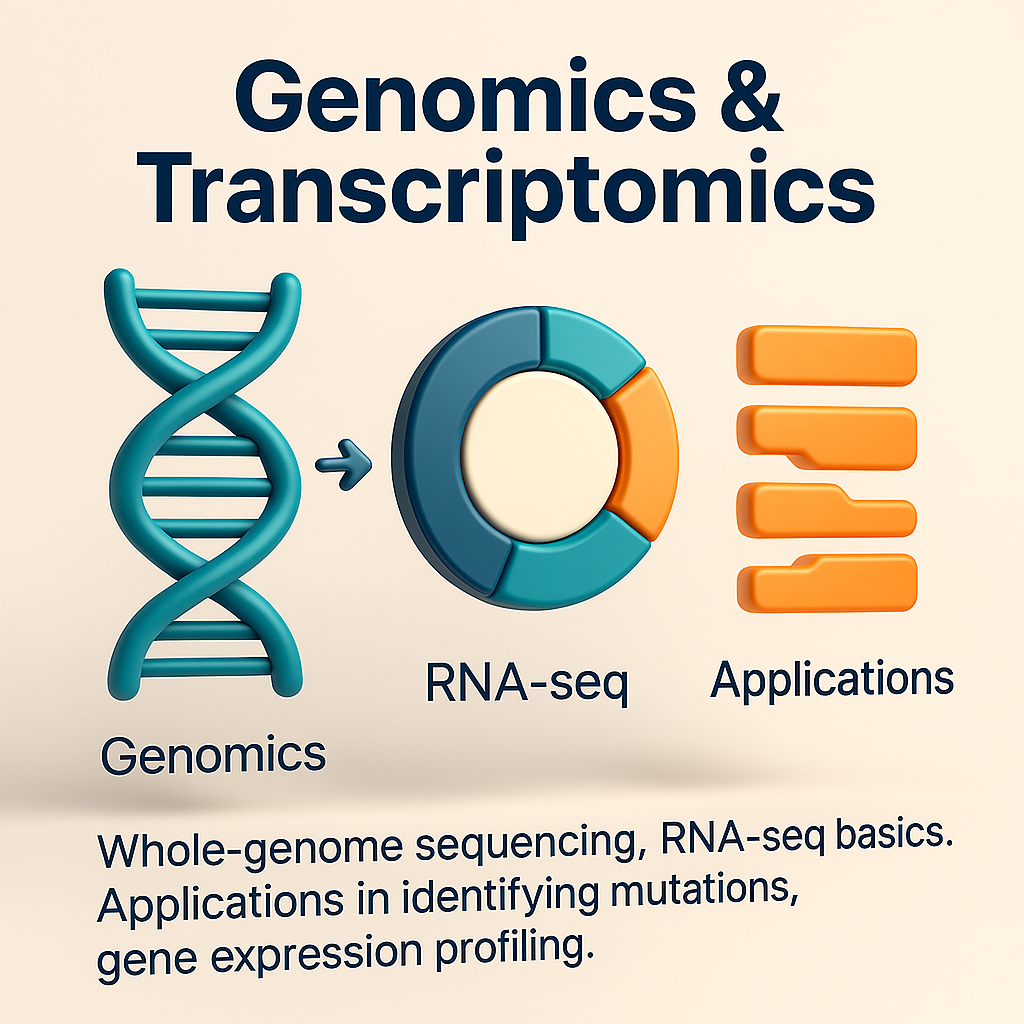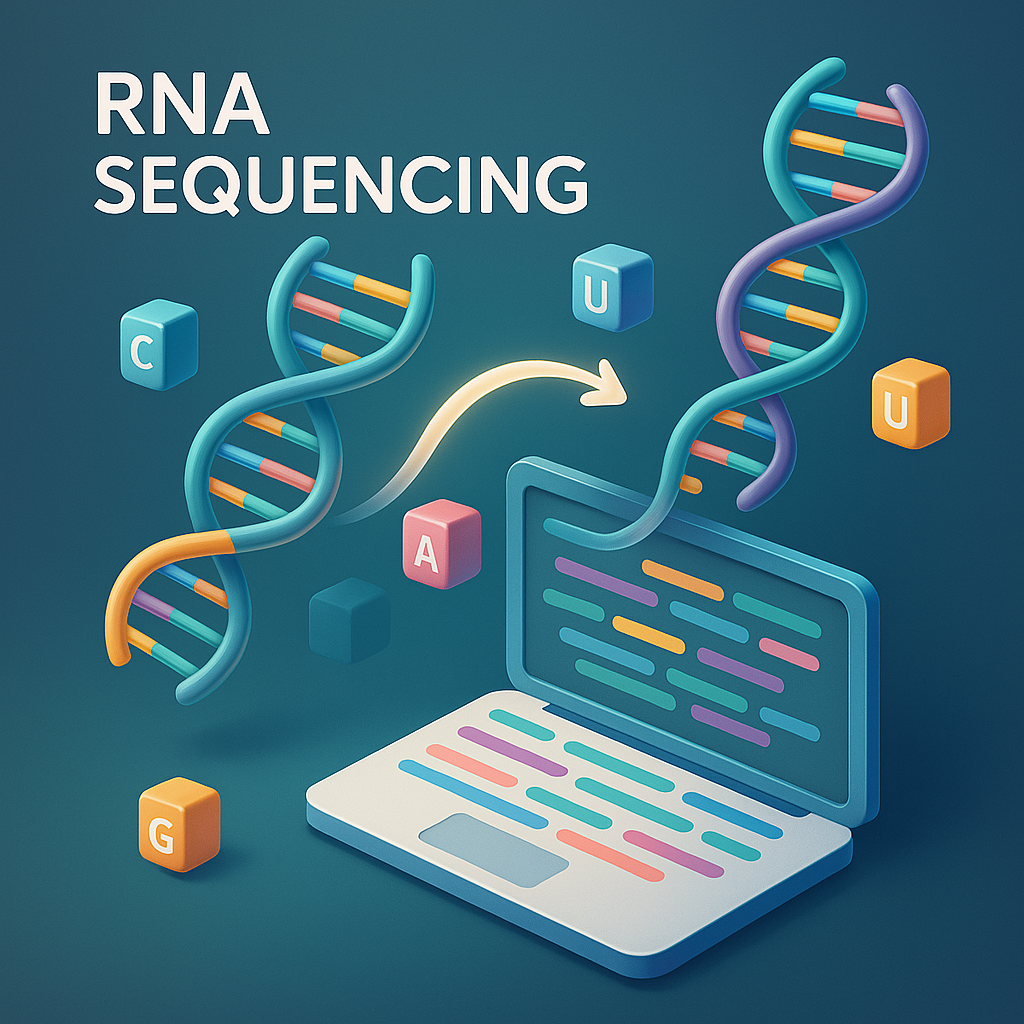 What is RNA-seq? A beginner’s guide for biotech students  “3D style illustration of RNA sequencing process, colorful nucleotides, DNA